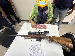 เจ้าพนักงานตำรวจภายใต้การอำนวยการสั่งการของ ว่าที่ พ.ต.อ.จารุกิตติ์ ศรีเดช ผกก.สภ.ตันหยง พ.ต.ท.ชลวิทย์ ดำดี รอง ผกก.สส.สภ.ตันหยง พ.ต.ท.พลากร มากมูล สว.สส.สภ.ตันหยง ได้สั่งการให้ เจ้าหน้าที่ ชุดสืบสวน สภ.ตันหยง ได้ร่วมการจับกุม บุคคลเพศหญิง อายุ 26 ปี ที่อยู่ ม.8 ต.โคกเคียน อ.เมืองนราธิวาส จ.นราธิวาส พร้อมด้วยของกลาง 1. อาวุธปืนยาวลูกกรด ขนาด .22 ยี่ห้อ ซีแซด ความยาวลำกล้องประมาณ 24 นิ้ว จำนวน 1 กระบอก 2. กล้องติดปืน จำนวน 1 กล้อง 3. แม็กกาซีน จำนวน 1 อัน 4.กระสุนขนาด .22 จำนวน 3 นัด ตำแหน่งที่พบของกลาง วางอยู่ในห้องนอนของ น.ส.พิมพ์ผกาฯ สถานที่เกิดเหตุ ม.2 ต.กะลุวอ อ.เมือง จ.นราธิวาส โดยกล่าวหาว่า มีอาวุธปืนและเครื่องกระสุนปืนไว้ในครอบครองโดยไม่ได้รับอนุญาต นำตัวส่ง พงส.สภ.ตันหยงดำเนินการต่อไป