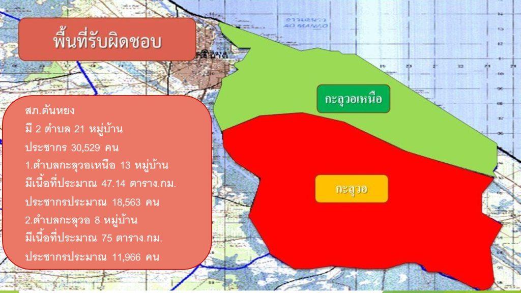 2.ตำบลกะลุวอ 8 หมู่บ้านมีเนื้อที่ประมาณ 75 ตาราง.กม. ประชากรประมาณ 11,966 คน